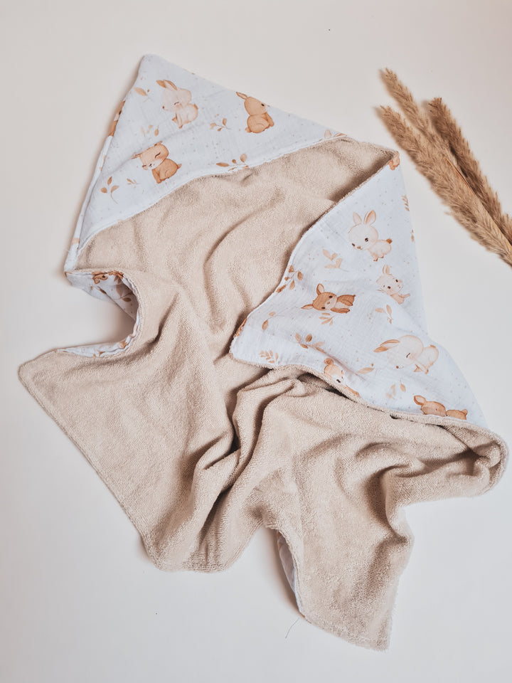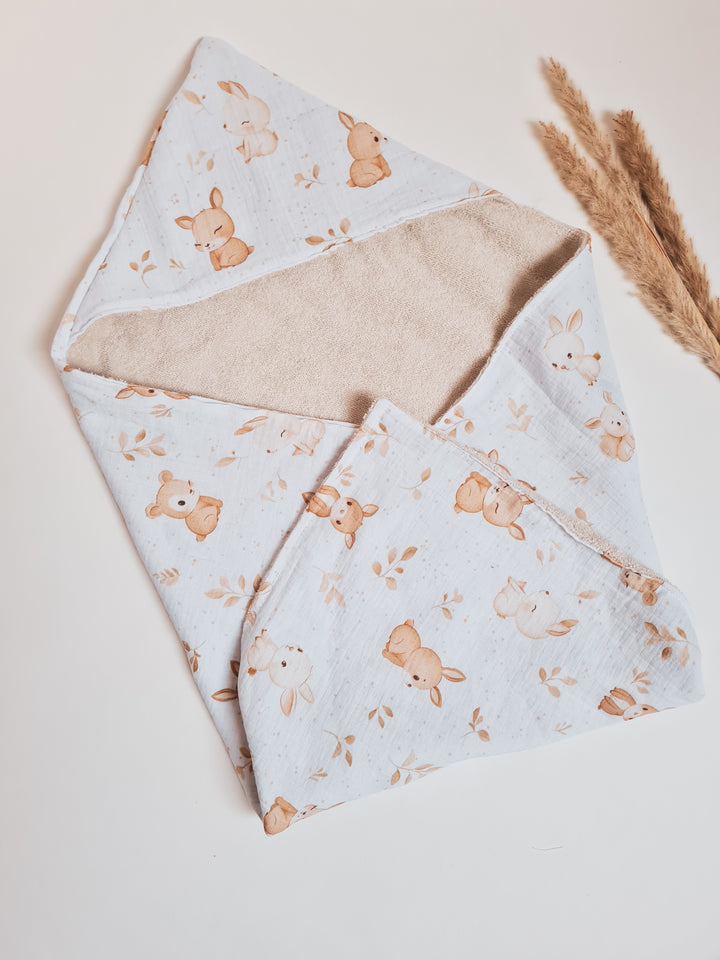 Narejena iz tetra blaga in bombažnega frotirja. Brisača s kapuco.