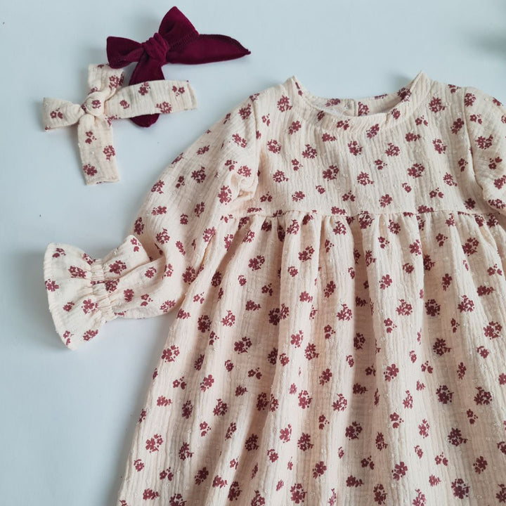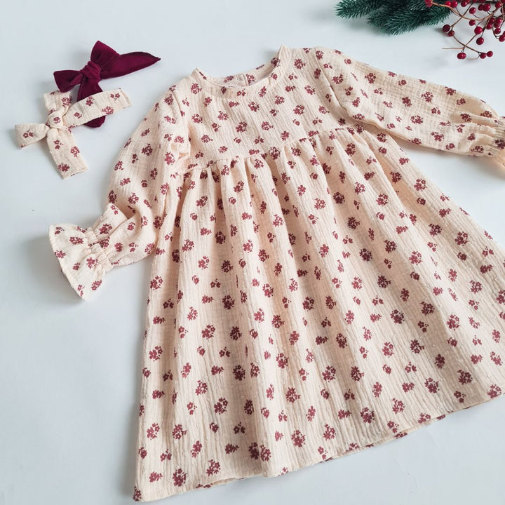 Rokavčki so zaključeni z nežno elastiko, kar poskrbi za čudovit, rahlo napihnjen videz in lepo poudari rokav. Na hrbtni strani se oblekica zapenja z gumbom, kar omogoča enostavno oblačenje in udobno prileganje.