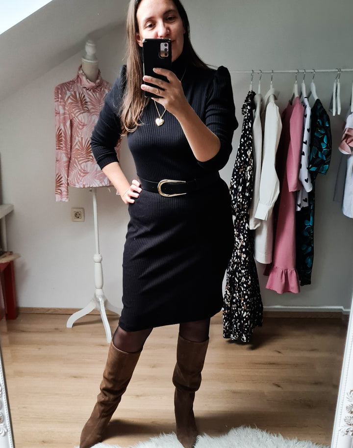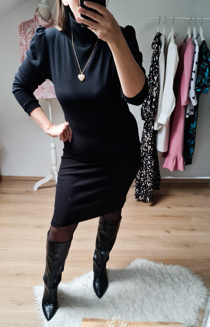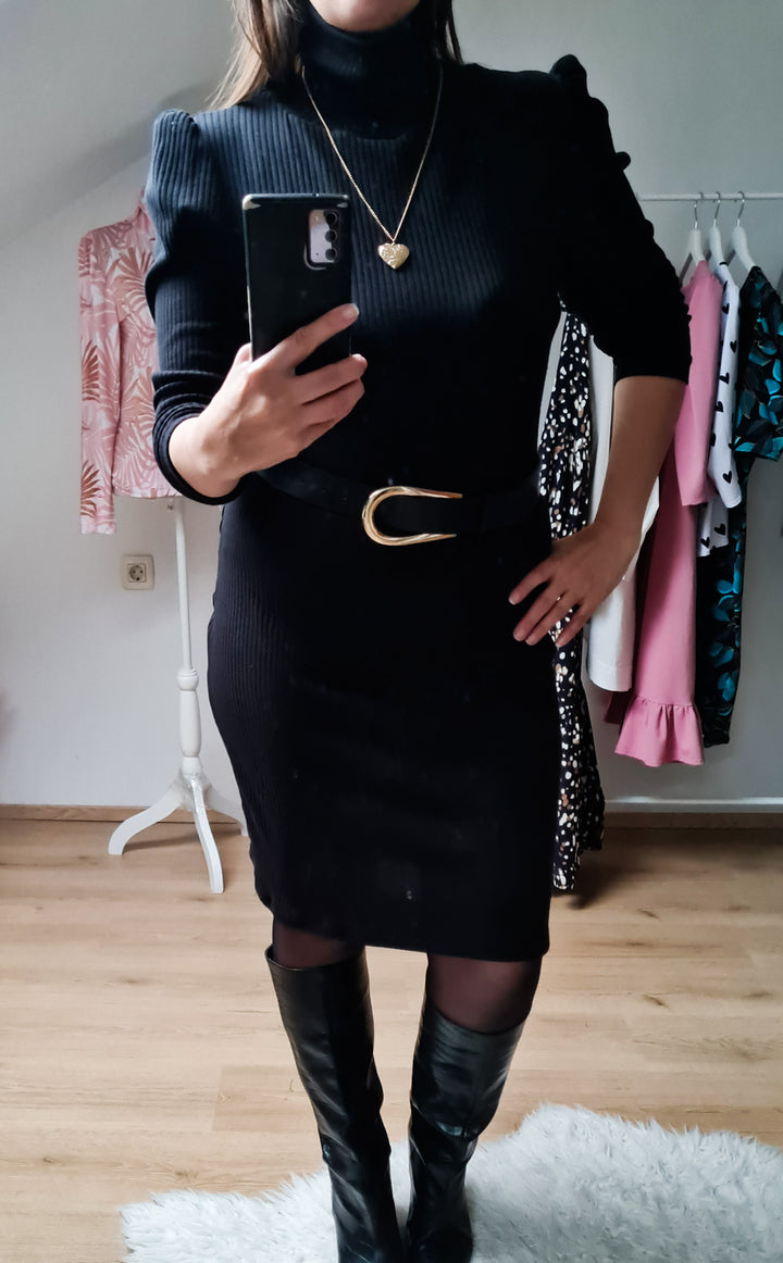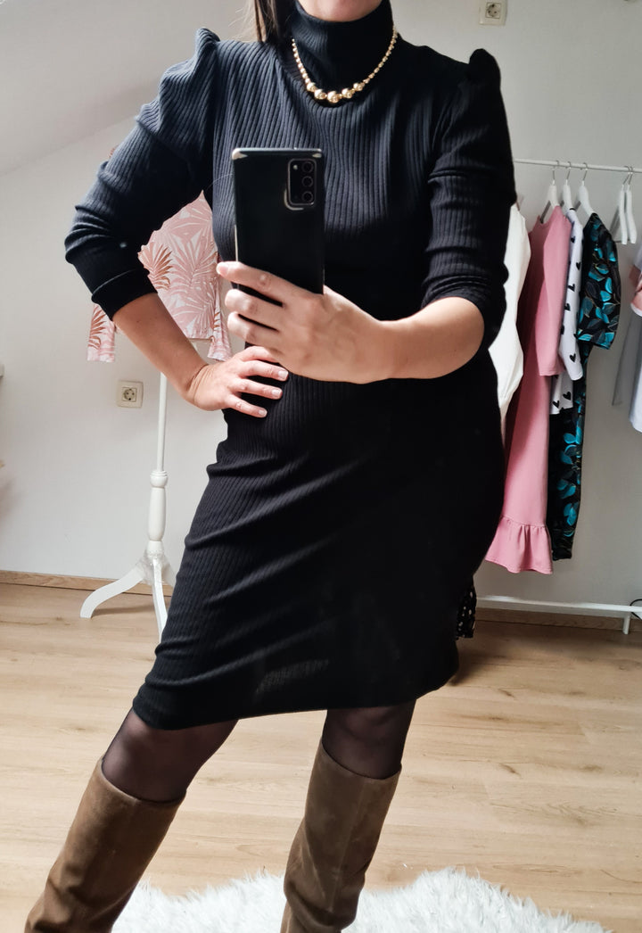 Dolžina je malo čez koleno. Na mojo velikost 170 cm. Se zelo lepo prilega in pride lepo popeta po telesu. Rokavi na ramenih nabrani. Ovratnik je puli , lahko pa vam naredim tudi odprt ovratnik.